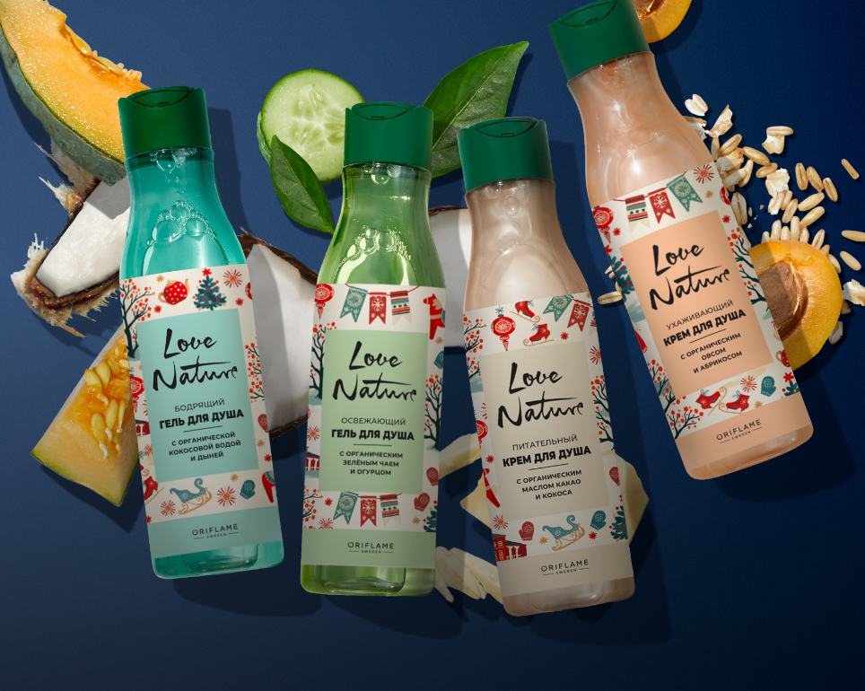 Ухаживающий крем для душа с органическим овсом и абрикосом Love Nature. Праздничный выпуск